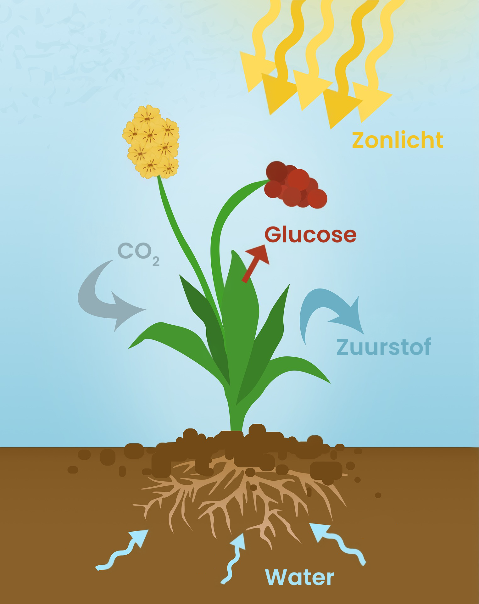 Elk groen blad werkt als een kleine fabriek. Onder invloed van zonlicht zetten planten water en CO2 om in zuurstof en glucose. De suikers (koolhydraten) zijn de brandstof die de boom gebruikt om te groeien. Dit proces, de fotosynthese, is de motor van al het leven op aarde. Zonder deze productie zou er geen voedsel en geen zuurstof zijn.