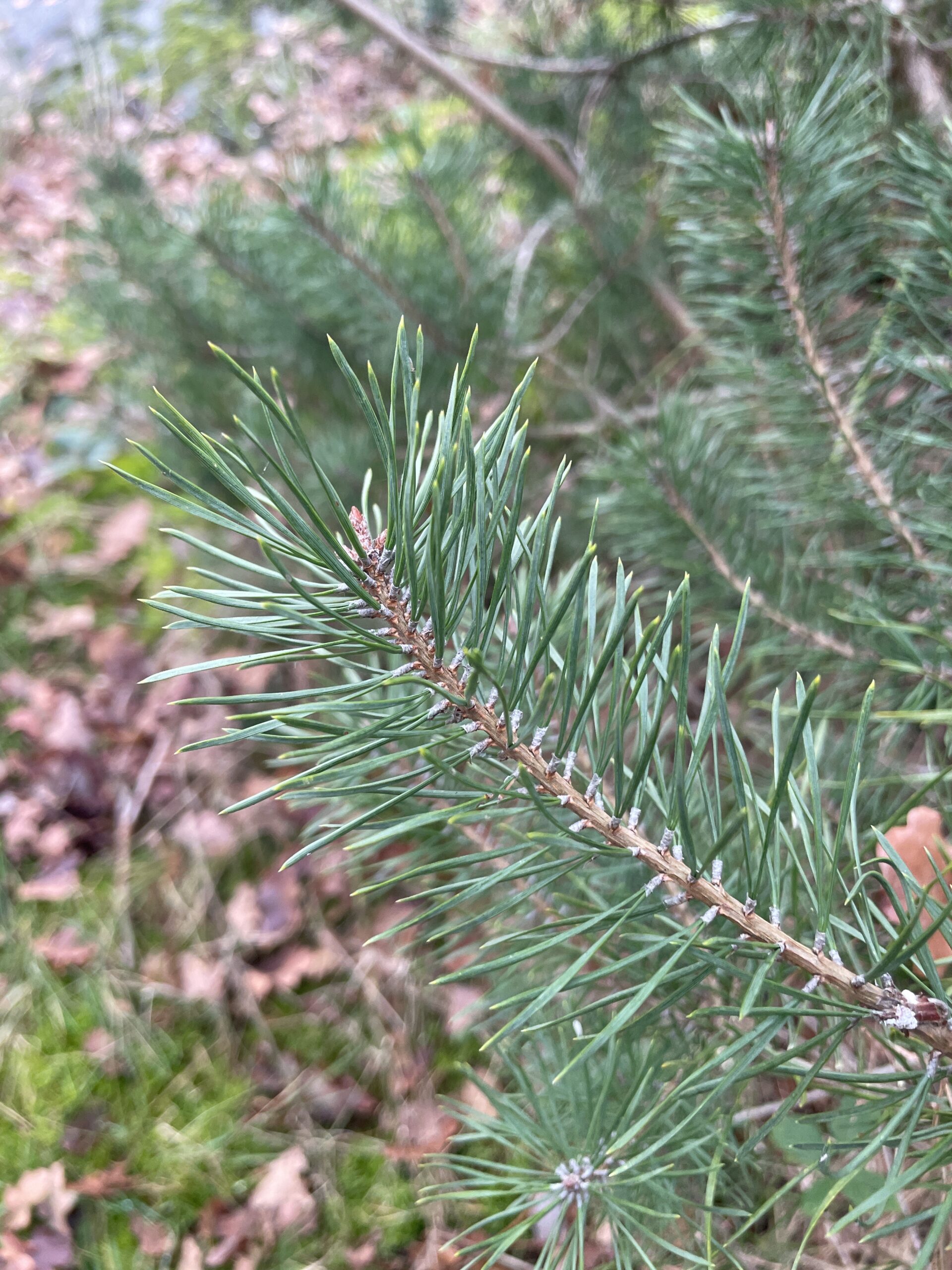 Zijn lange, blauwgroene naalden groeien altijd in paren van 2 en worden zo'n 3 tot 7 cm lang. Hiermee valt hij makkelijk te onderscheiden van andere dennensoorten. Een veel voorkomende zwarte den (Pinus nigra) heeft bijvoorbeeld naalden van 10 cm of langer.